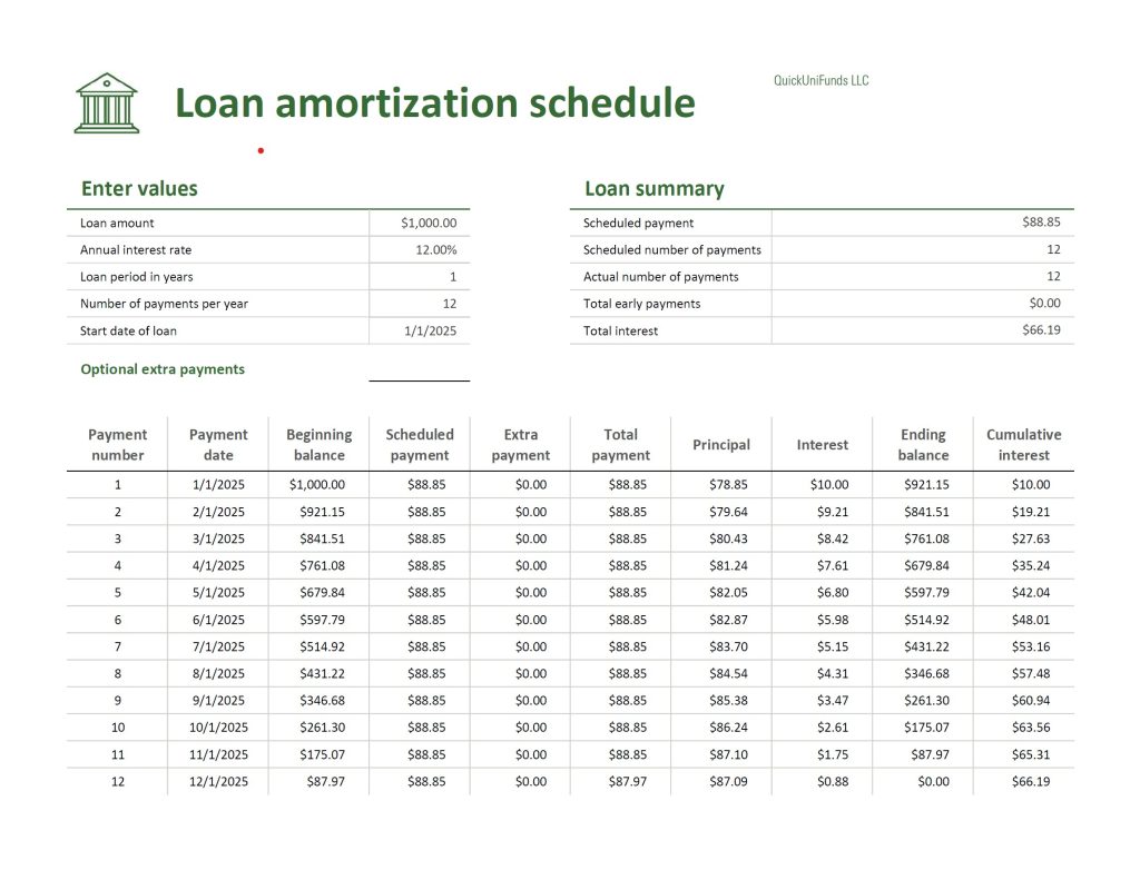 The example of loan repayment is given under. Here, the customer borrowed $1000. They need to make 12 payments of $88.85 to repay their loan amount. The customer paid $66.19 interest in total when they repaid the loan. The customer can decide to repay the loan faster if they wish to save on their interest expenses. Interest rate used in the following loan repayment schedule is 12.00% per annum.